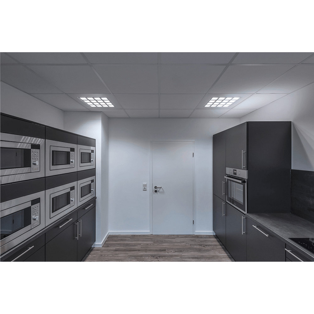 Le plafonnier encastré LED a des dimensions de 59,5 x 59,5 x 3,6 cm et pèse 2,9 kg. Avec une profondeur de seulement 5 cm, l'installation est facile. Avec un flux lumineux de 3350lm et une température de couleur de 4000K, la lumière offre une illumination lumineuse et agréable.