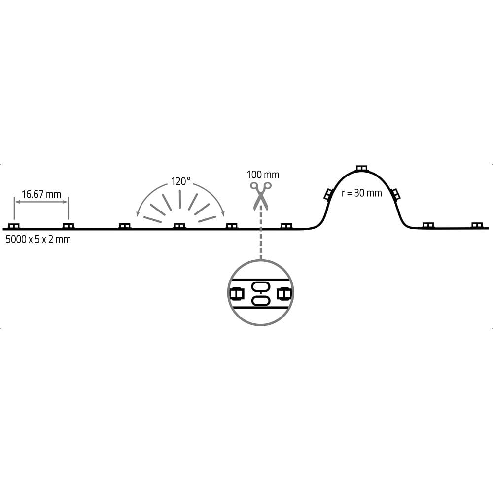 La bande LED VARDAflex PLUS DTW est équipée d'un dos auto-adhésif qui permet une installation professionnelle dans des profils en aluminium. La bande est divisible et peut être coupée tous les 10cm, permettant une adaptation flexible à différents besoins d'éclairage. Avec un rayon de courbure minimal de 3cm et une longueur maximale de 5 mètres par connexion, cette bande LED est polyvalente et facile à installer.
