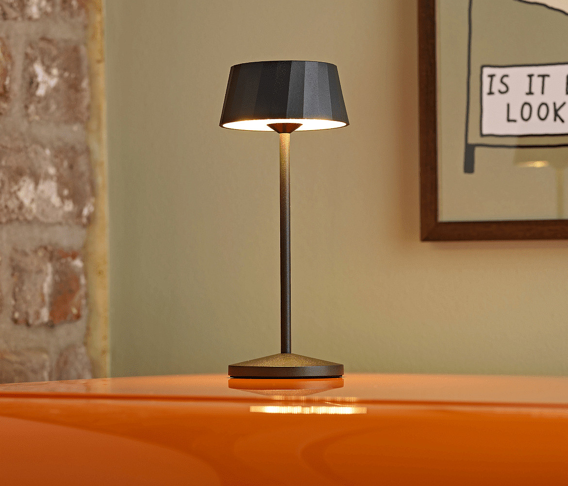 The FACETTA rechargeable table lamp weighs only 0.48 kg, making it easy to transport. Its high-quality housing in night black provides an elegant look and durable quality. The combination of thoughtful design, practical functions, and easy operation makes the FACETTA by SIGOR an ideal companion for any interior design.