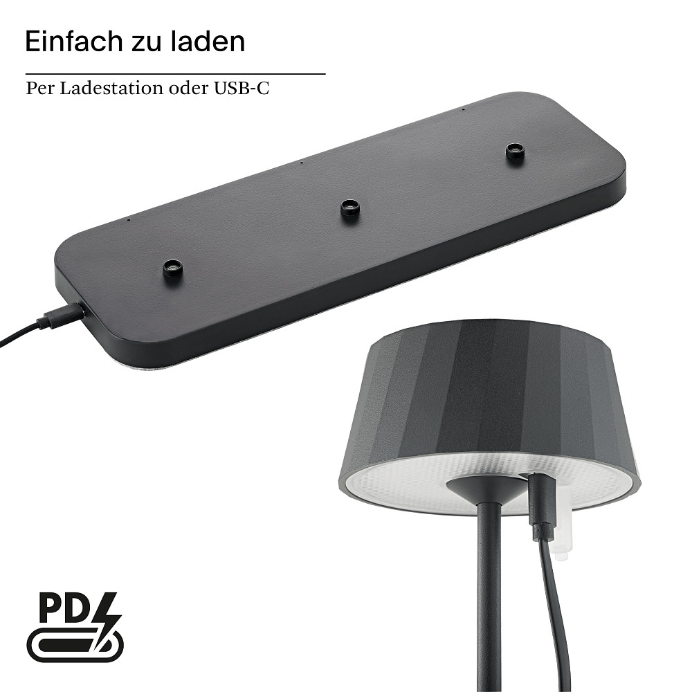 Equipped with a powerful, replaceable battery with a capacity of 4,000 mAh, the FACETTA table lamp offers a maximum lighting duration of up to 12 hours. Charging is conveniently done via the included multi-charging station or directly via the USB-C port on the lamp head. The lamp is also USB-C Power Delivery (PD) compatible, ensuring fast and efficient charging.