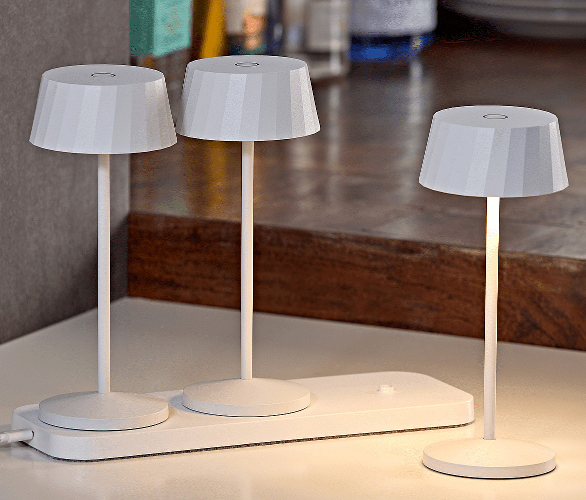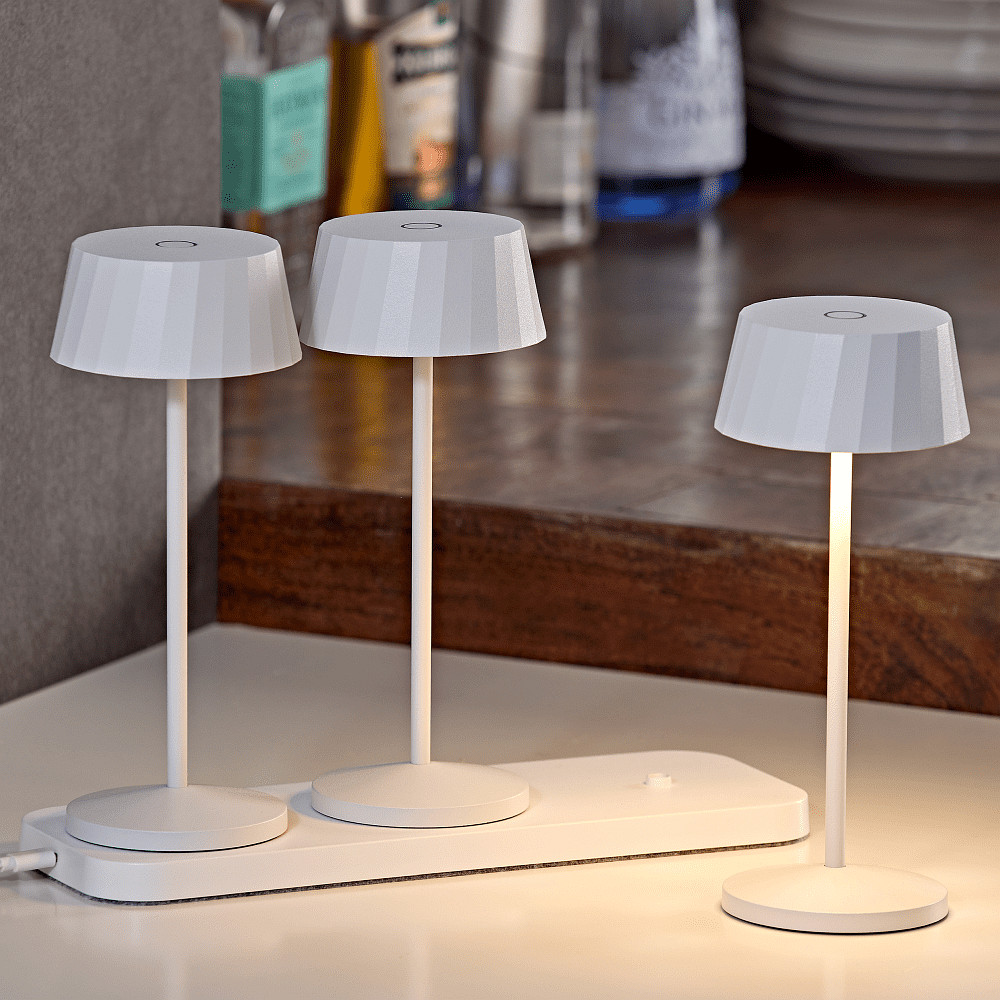The LED rechargeable table lamp FACETTA from SIGOR is offered as a practical set of 3 and impresses with its modern snow-white appearance. With a compact size of 22.2 cm in height and a lampshade diameter of 9.2 cm, it is ideal for a wide range of applications. Weighing only 0.48 kg, the lamp is also particularly handy. Each lamp features a single light source and is equipped with an integrated touch dimmer that allows easy and stepless adjustment of the brightness.