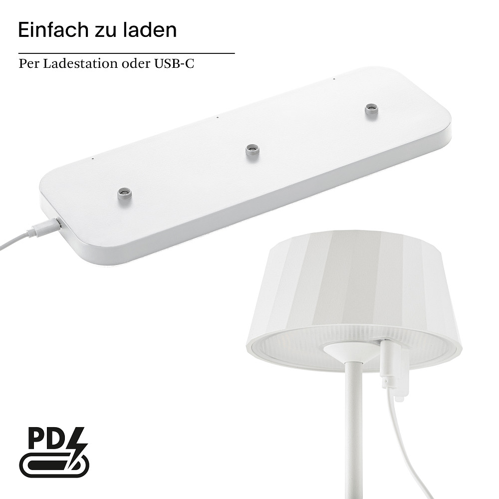 The lamp operates with a powerful, replaceable battery with a capacity of 4,000 mAh, enabling a maximum lighting time of up to 12 hours. Power supply is provided via the included multi-charging station or directly via USB-C connection in the lamp head, which is also compatible with USB-C Power Delivery (PD). These charging options guarantee a fast and uncomplicated charging process, making the user independent of mains power sources.