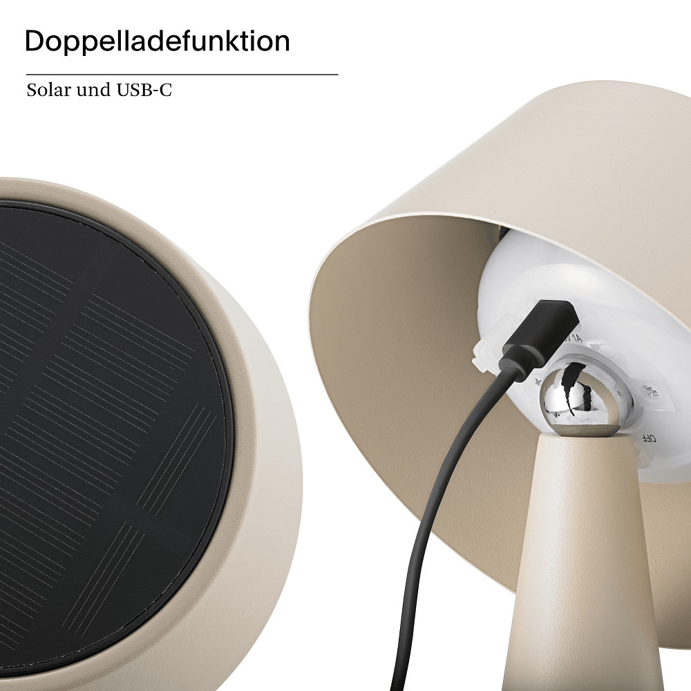 The SOLINO battery table lamp is powered by an integrated, replaceable battery with a capacity of 2,600 mAh. This allows for a maximum lighting duration of up to 6.5 hours after a full charge. The lamp can be easily charged via a USB-C cable. Additionally, a solar panel is included in the delivery, enabling the battery to be charged in an environmentally friendly way and independently from power outlets using solar energy. This way, you always have a flexible and sustainable light source at hand.