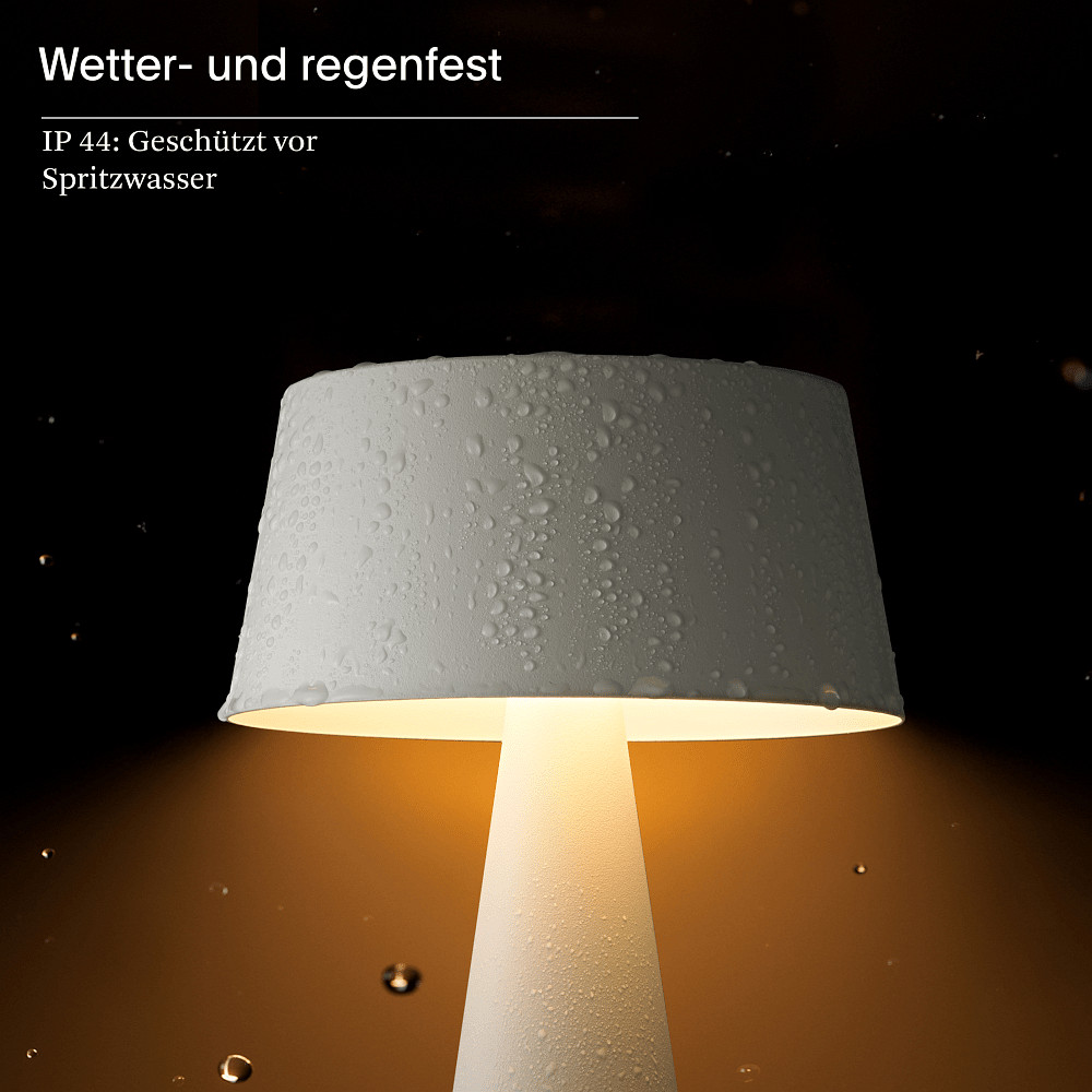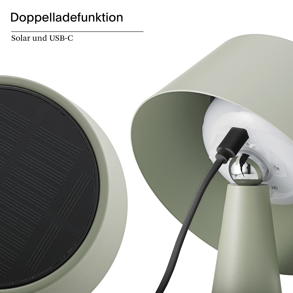 For flexible use, the table lamp is equipped with an integrated battery with a capacity of 2,600 mAh, allowing for a maximum lighting duration of up to 6.5 hours. The battery is also replaceable, which extends the product’s lifespan. Charging is done either via the included solar panel or conveniently via USB-C connection, ensuring simple and environmentally friendly energy supply.