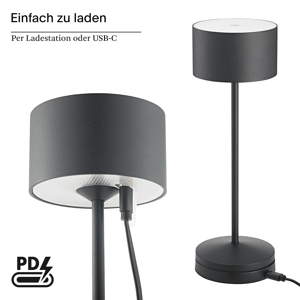A major advantage of the VELUNA is its integrated, replaceable battery with a capacity of 3,600 mAh. The maximum lighting duration is an impressive 14 hours, ensuring long-lasting light without constant recharging. Charging can be done conveniently via the included charging station or alternatively via USB-C directly in the lamp head. Support for USB-C Power Delivery (PD) ensures fast and efficient charging.