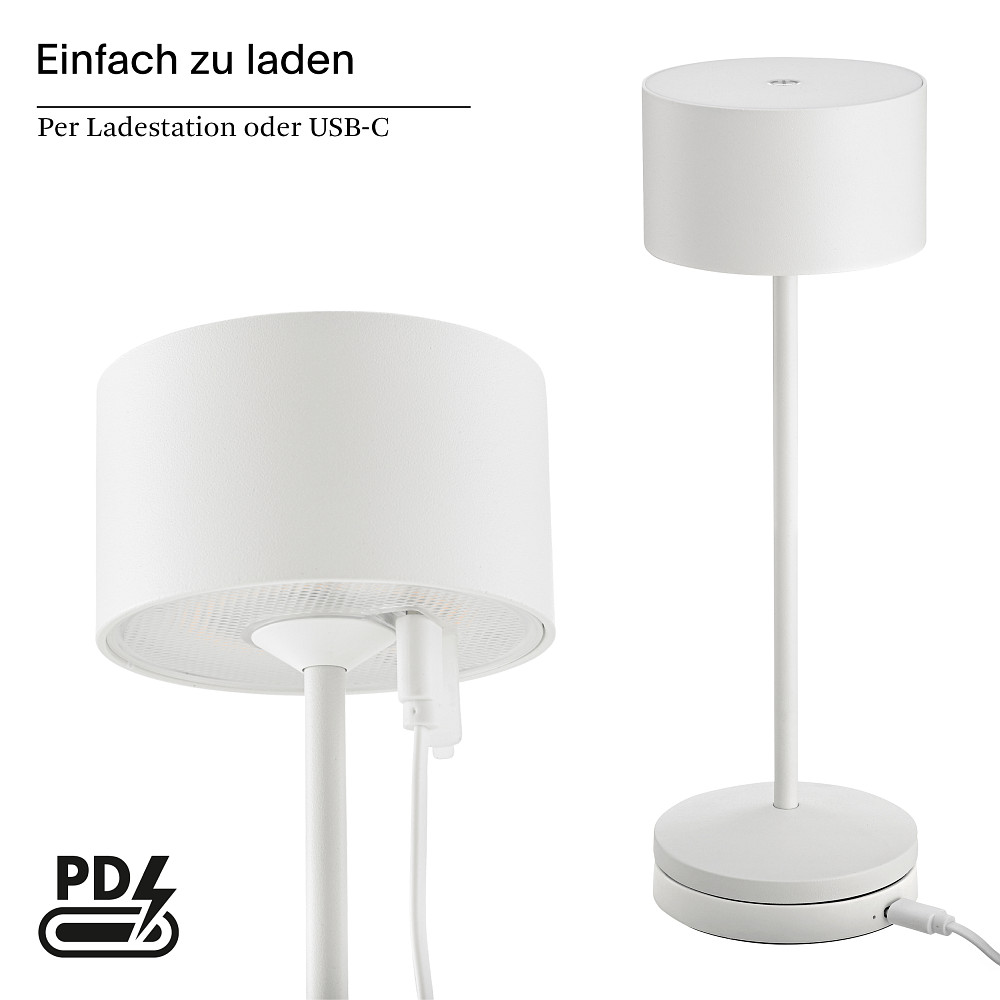 The combination of dimmable light control, selectable color temperatures, and long battery life makes the VELUNA a versatile companion for different lighting requirements. The warm white light creates a pleasant atmosphere, while the simple touch dimmer operation guarantees comfort. Thanks to the replaceable battery and versatile charging options, the lamp is especially durable and flexible in use.