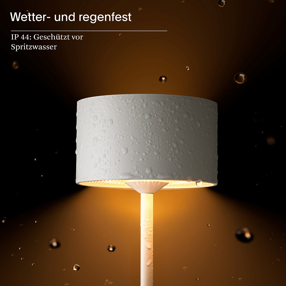 The lamp operates with a power consumption of only 1 watt, which is very energy-efficient. It runs on a voltage of 3.7 volts supplied by the built-in battery, which has a capacity of 3,600 mAh. This battery is replaceable and allows for a maximum lighting duration of up to 14 hours. The VELUNA table lamp has a protection class of IP44, providing a certain level of protection against splashing water and dust.