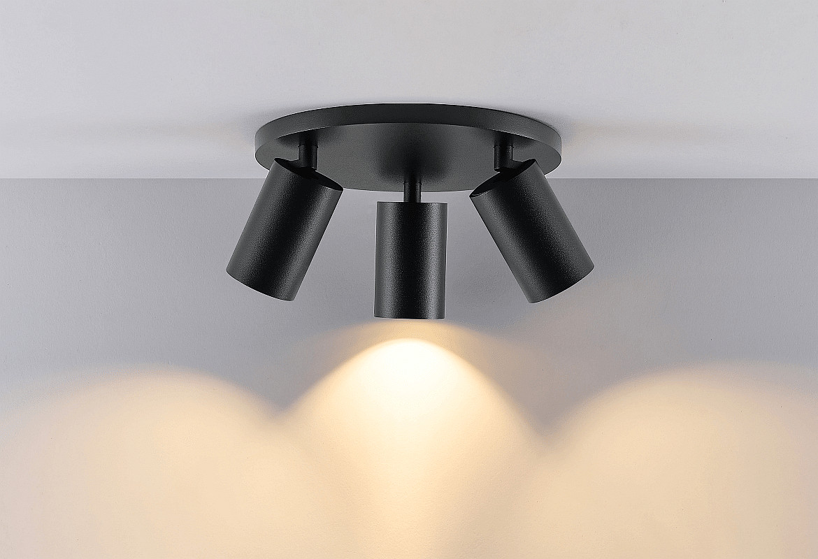 The three spotlight heads can each be rotated 350° and tilted 90°, allowing the light beam to be easily directed individually. This enables targeted lighting of desired areas and creates a pleasant lighting atmosphere. The luminaire is compatible with GU10 high-voltage reflector lamps, which can be varied according to preference in terms of consumption, brightness, light color, and color rendering.