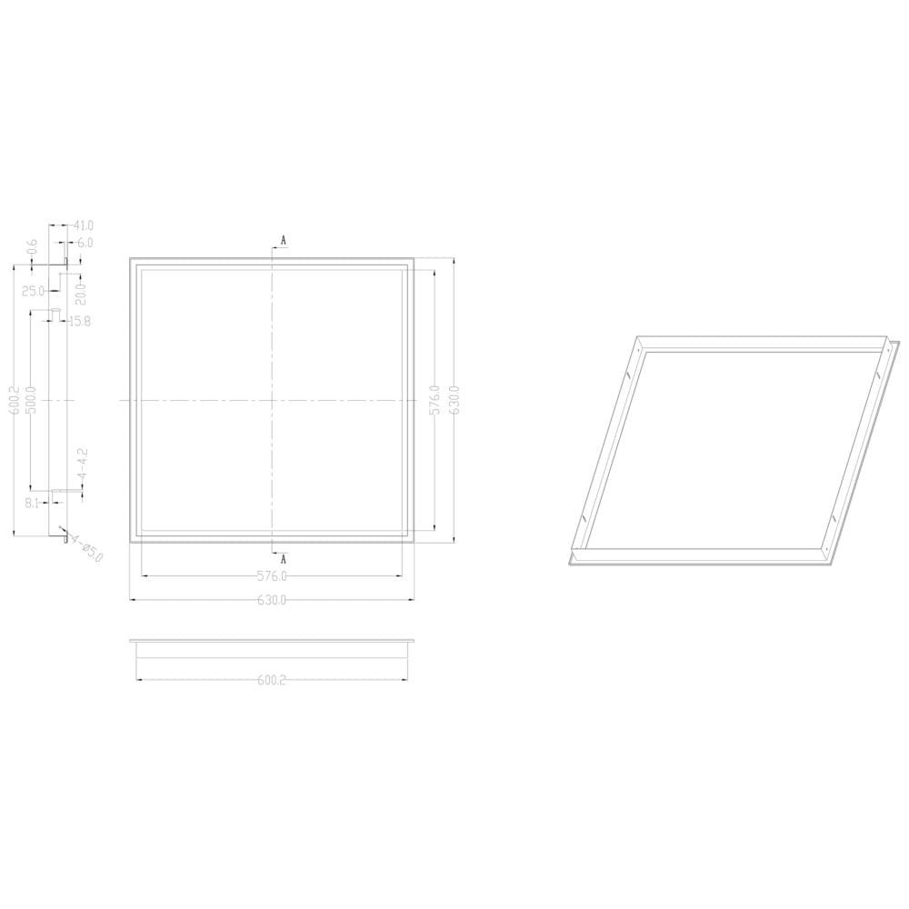 Der Einbaurahmen besitzt eine rechteckige Einbauöffnung mit einer Länge und Breite von jeweils 61 cm. Diese Maße sind speziell auf das 60x60 cm LED Panel STANDARD abgestimmt und gewährleisten einen perfekten Sitz ohne Spielraum. Die Gesamtgröße des Rahmens beträgt 63 x 63 x 4,1 cm (Länge x Breite x Höhe), was eine einfache Montage und Integration in gängige Deckensysteme ermöglicht.
