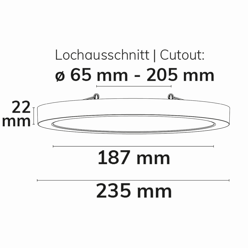 Die LED Aufbau-/Einbauleuchte FLEX PRO DN235 von ISOLED überzeugt durch ihre Anpassungsfähigkeit und hochwertige Verarbeitung. Mit einem Durchmesser von 23,5 cm und einer schlanken Einbautiefe von nur 2,3 cm eignet sich diese Leuchte optimal für verschiedene Montagemöglichkeiten. Sie kann sowohl als Aufbau- als auch als Einbauleuchte verwendet werden und passt dank ihrer arretierbaren Halteschiene mit verschiebbaren Clipfedern in Einbauöffnungen von 6,5 cm bis 20,5 cm Durchmesser. So lassen sich vorhandene Bohrlöcher problemlos nutzen, was die Installation besonders zeitsparend macht.