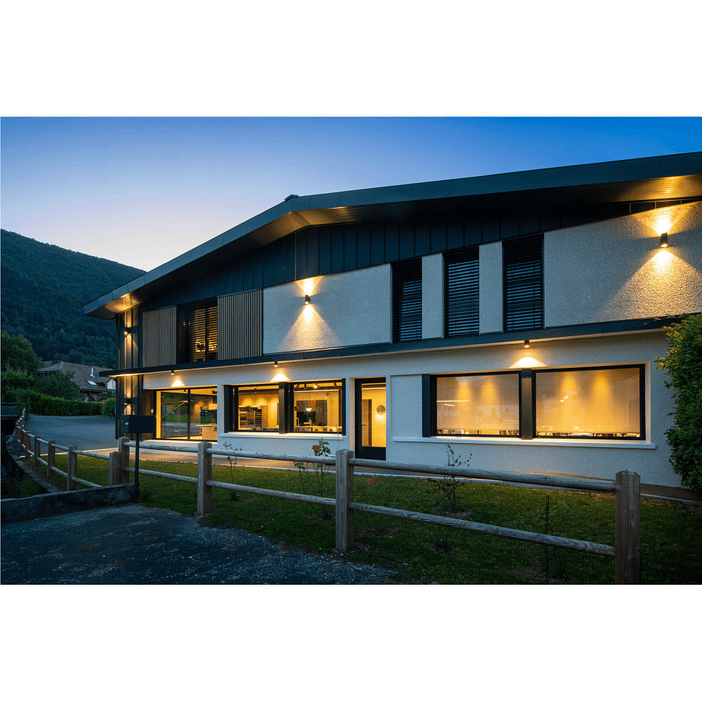 Die ENOLA ROUND UP/DOWN CCT ist ein puristischer Wandstrahler mit zweiseitiger Lichtabgabe nach oben und unten. Dank des rückseitigen Schalters kann die Lichtfarbe vor der Montage zwischen Warmweiß und Neutralweiß gewählt werden. Die Leuchte wird mit einem vormontierten, wechselbaren 38° Reflektor geliefert, optional ist auch ein 60° Reflektor erhältlich.