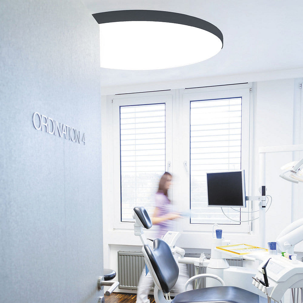 Mit einem Durchmesser von 100 cm und einer Höhe von 6,5 cm besticht die Deckenleuchte durch ein schlankes, modernes Design. Das Gehäuse aus robustem Kunststoff in schwarzer Farbe ist unempfindlich und pflegeleicht. Der integrierte Lichtverteiler mit Diffusorlinse sorgt für eine gleichmäßige Lichtverteilung und verhindert unangenehme Blendungen, da der UGR-Wert unter 19 liegt. Dadurch entsteht ein angenehmes und augenschonendes Lichtbild.