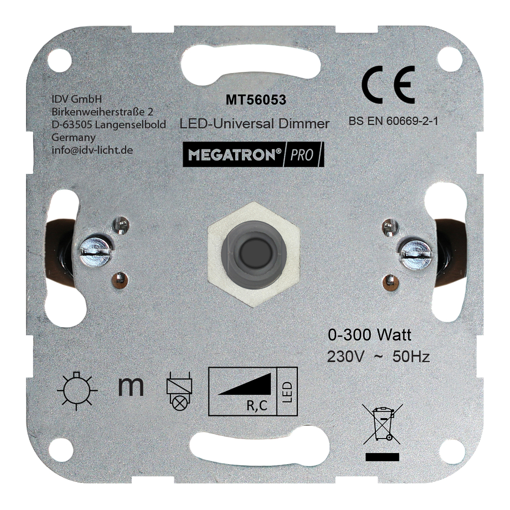 The LED Universal Dimmer from MEGATRON PRO offers a flexible solution for stepless regulation of light sources with a power of up to 300W. With an operating voltage of 220 to 250 volts and a mains frequency of 50 Hz, the dimmer is compatible with most standard power grids. The dimmer is specially designed for use with LED lamps but also supports other load types thanks to its universal load function. This allows various types of lamps to be dimmed easily and conveniently.