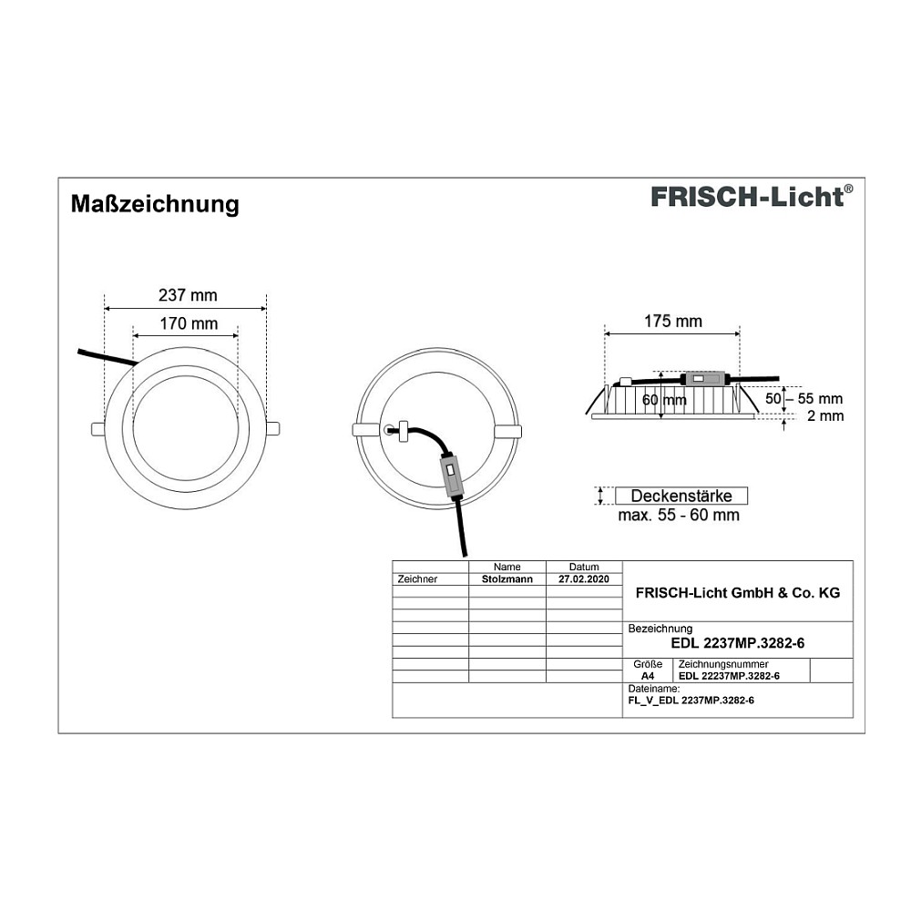 Das LED Einbau-Downlight CCT ist ein hochwertiges Produkt der Marke Frisch-Licht, das sich ideal für den Einsatz in Decken im Innenbereich eignet. Mit einem sichtbaren Durchmesser von 23,7 cm und einer Materialstärke von 6 cm bietet es eine moderne und ansprechende Beleuchtungslösung. Der Lichtaustritt beträgt 17 cm und sorgt für eine gleichmäßige Lichtverteilung mit einem Ausstrahlungswinkel von 75°.