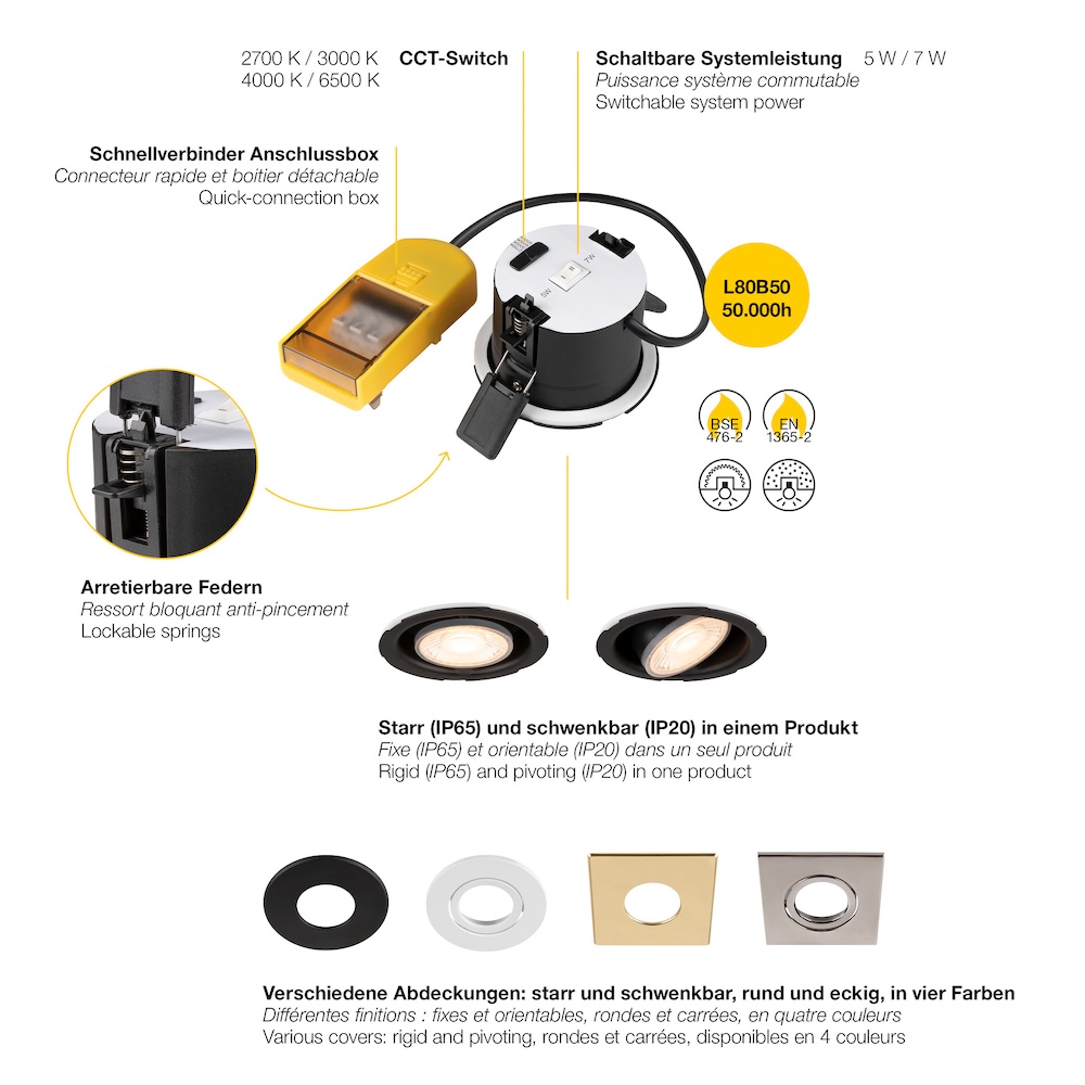 Die Einbauleuchte bietet vier verschiedene Farbtemperaturen: 2700K, 3000K, 4000K und 6500K. Damit können Sie die Lichtfarbe ganz nach Ihren Bedürfnissen anpassen - von warmweiß über neutralweiß bis hin zu kaltweiß. Diese Vielfalt sorgt für angenehme Lichtverhältnisse, die sowohl entspannend als auch anregend wirken können. So schafft das UNIVERSAL DOWNLIGHT MOVE die perfekte Atmosphäre für jeden Anlass.