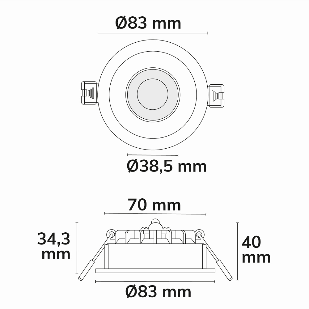 Der LED Einbaustrahler VARIO-68 von ISOLED besticht durch seine kompakte Bauweise mit einem Durchmesser von nur 8,8 cm und einer Einbautiefe von 3,43 cm. Er ist speziell für eine einfache Installation konzipiert und wird inklusive Clipfedern geliefert, die einen sicheren Halt gewährleisten. Die abnehmbare Blende ermöglicht einen unkomplizierten Zugang zu den integrierten Schiebeschaltern, mit denen Sie Lichtfarbe und Leistung individuell anpassen können.