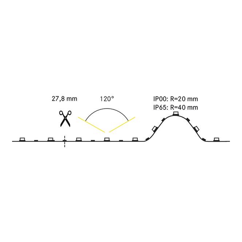 Die selbstklebende Flexplatine lässt sich leicht anbringen und flexibel biegen. Mit einem minimalen Biegeradius von 20 mm passt sich die LED-Flexplatine verschiedenen Oberflächen an. Die Schutzklasse 3 und die IP-Schutzart IP00 gewährleisten eine sichere Anwendung.