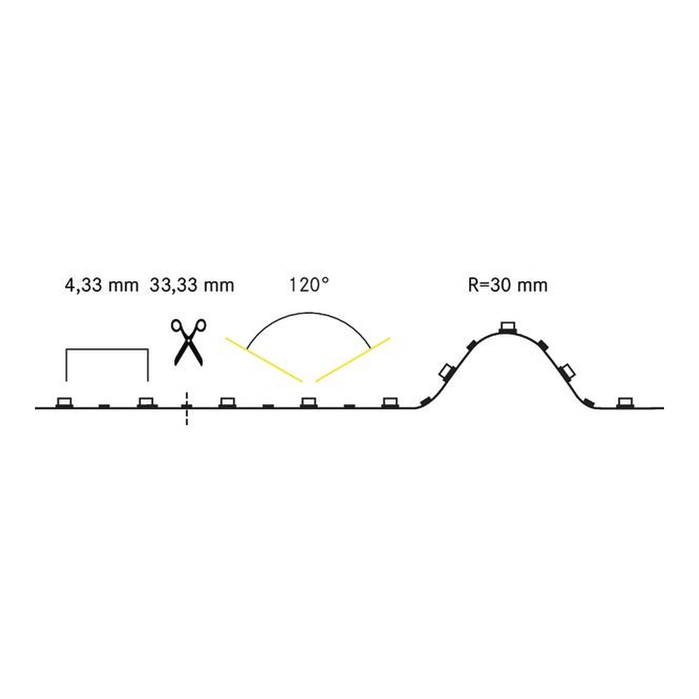 Weitere Informationen: Anzahl der Leuchtmittel pro Meter: 210, Lampenleistung je Meter: 14,4, Polzahl: 2, Länge der einzelnen Abschnitte: 33,33 mm, Lichtstrom je Meter: 1500