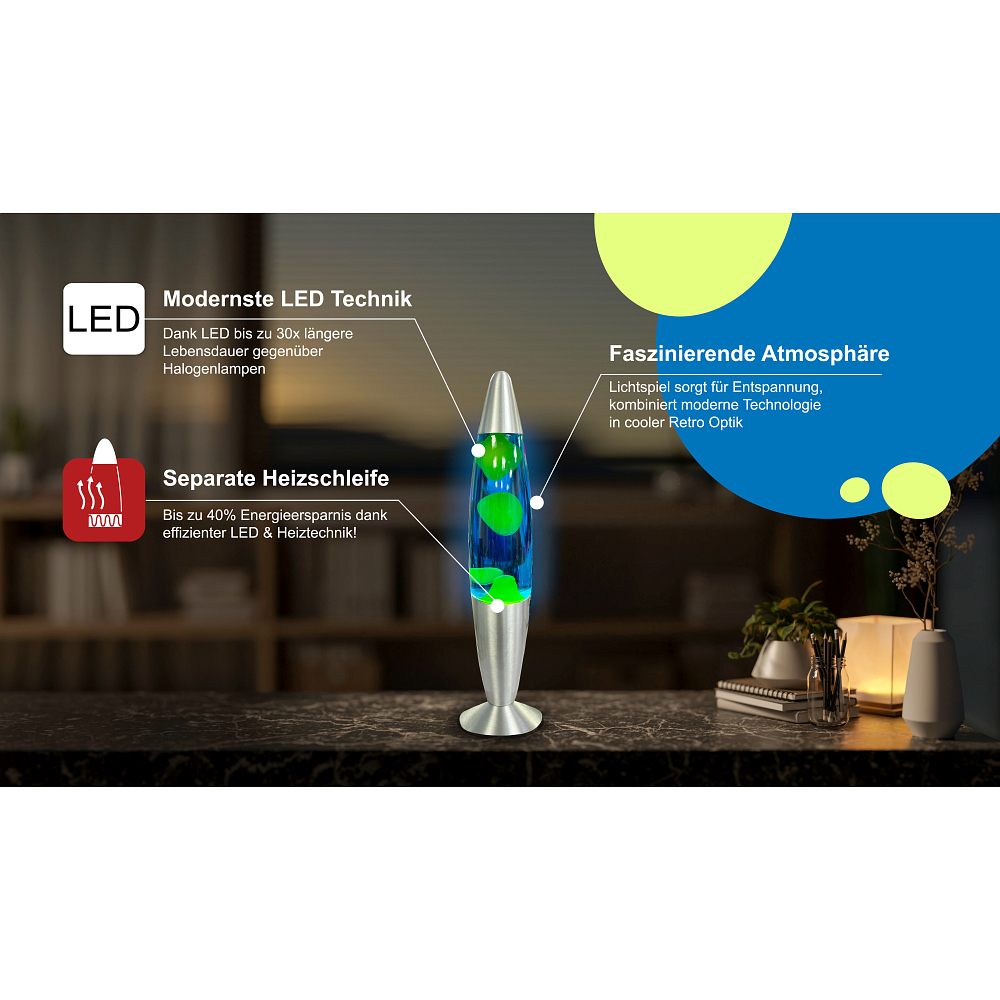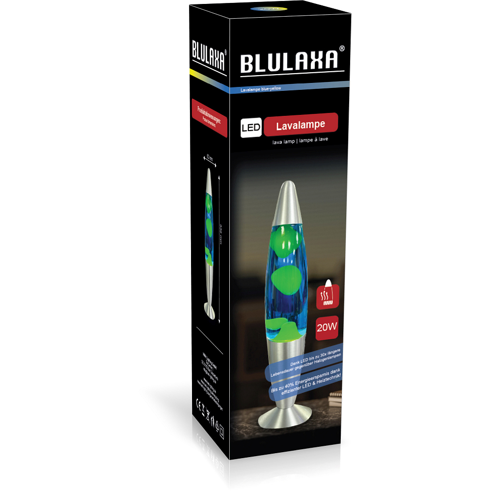 LED Lavaleuchte, 34cm, 310ml, 20W, 1200-5300K, 2lm, IP20, gelbes Wachs + blaue Flüssigkeit