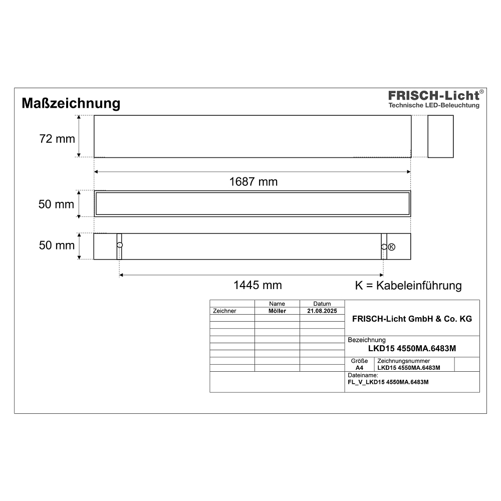 Die LED-Lichtkanal-Einzelleuchte von FRISCH-Licht® bietet mit einer Länge von 168,7 cm und einem modernen Design aus Aluminium und Polymethylmethacrylat (PMMA) eine langlebige und robuste Lösung für verschiedene Beleuchtungsanforderungen. Mit einer Lichtfarbe von warmweiß (3000K) und einem Farbwiedergabeindex von über 80Ra sorgt sie für ein angenehmes und natürliches Licht. Die Leuchte eignet sich besonders für professionelle Anwendungen und überzeugt durch ihre hohe Lichtausbeute von bis zu 130 Lumen pro Watt.