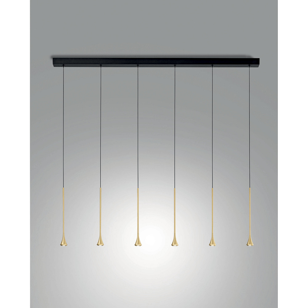 Die LED Pendelleuchte SUSA von Fabas Luce besticht durch ihr modernes und zugleich zeitloses Design. Mit einem schwarzen Metallgestell und satiniertem Messingakzenten fügt sie sich harmonisch in verschiedene Einrichtungsstile ein. Die sechs einzelnen Spots mit einem Durchmesser von 4 cm und einer Höhe von 32 cm sorgen für eine ausgewogene Optik, während der Baldachin mit den Maßen 110 x 5 x 3,5 cm für eine stabile Befestigung an der Decke sorgt. Das Gesamtgewicht der Leuchte beträgt 2,2 kg, was eine einfache Montage ermöglicht.