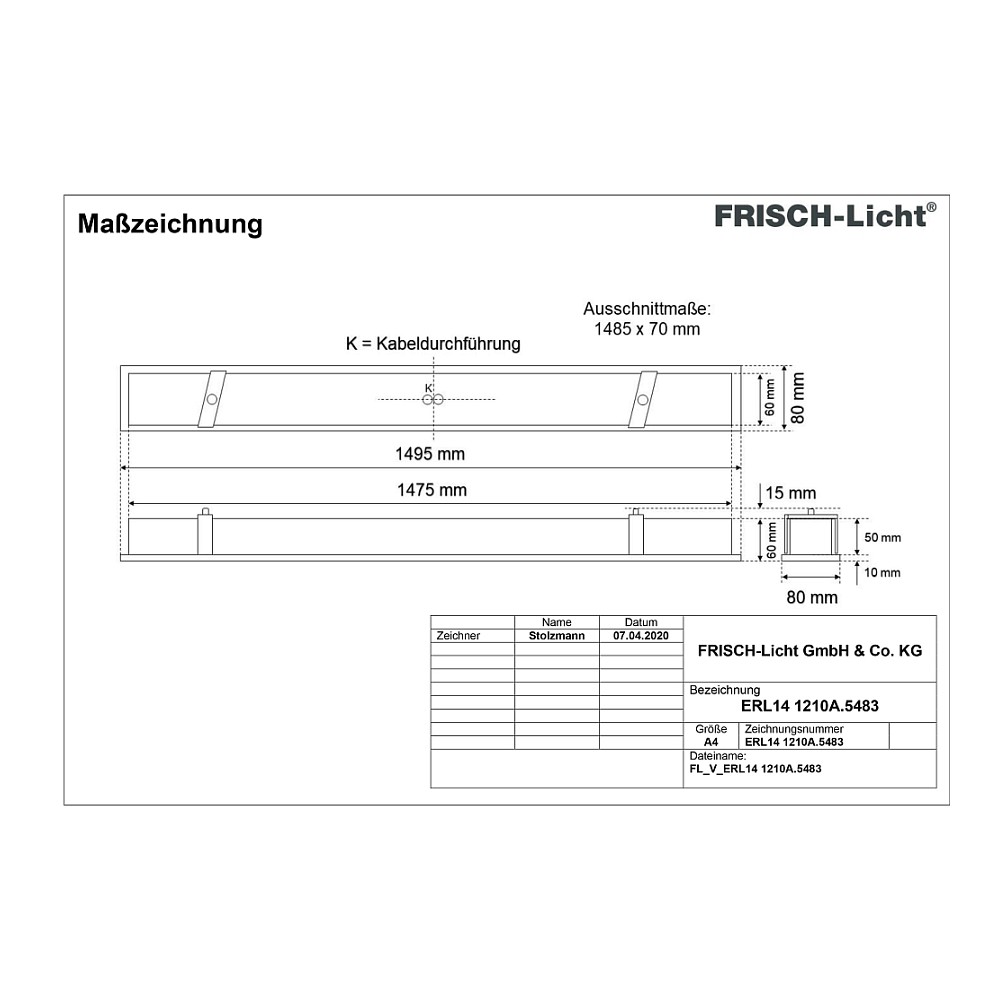 The recessed opening of the light has a rectangular length of 154.5 cm and a width of 8 cm. The operating voltage is 220-240V~ and the mains frequency is 50-60Hz. The temperature range for operation is -20 to +35 °C. Additionally, the light is protected according to IP40.