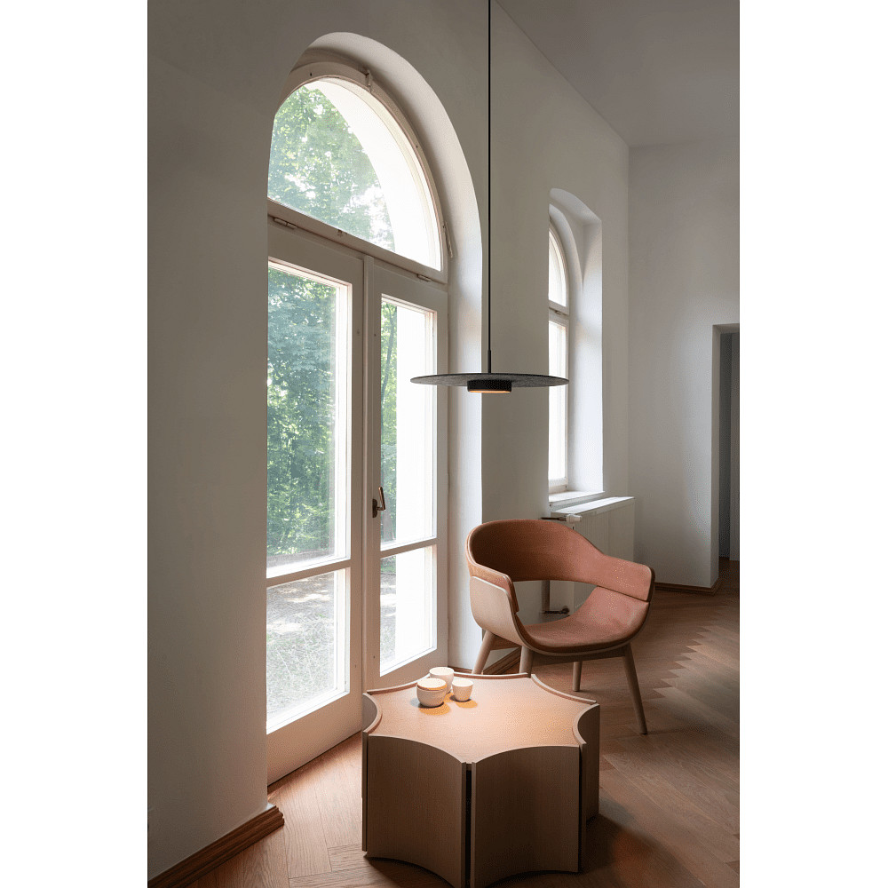 Durch die Filzstruktur des Leuchtenschirms wird das Licht sanft gebrochen und gleichmäßig verteilt. Dies verhindert unangenehme Blendungen und schafft ein angenehmes, diffuses Licht. So eignet sich der Schirm ideal, um Räume mit einer warmen und einladenden Atmosphäre zu versehen.