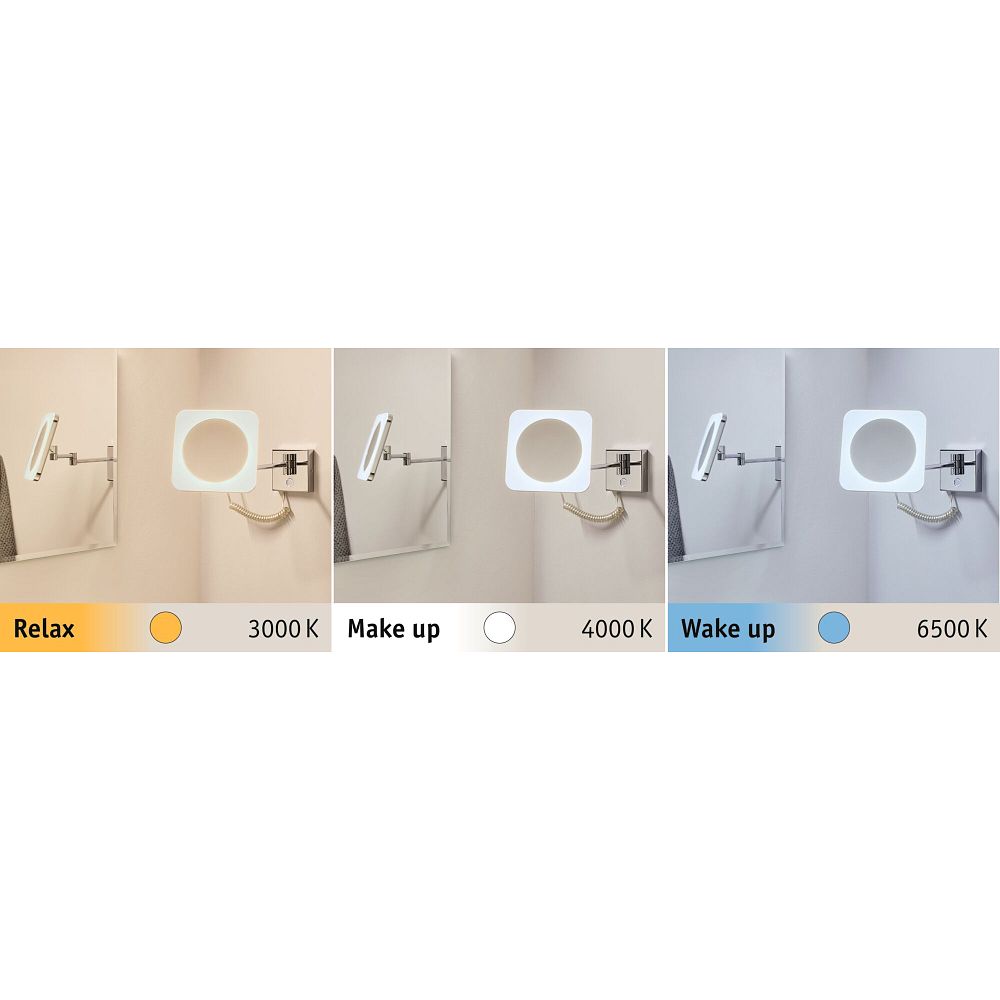La fonction WhiteSwitch intégrée permet de basculer par étapes entre trois couleurs de lumière : blanc extra chaud (2700 K) pour des moments de détente, blanc neutre (4000 K) pour un maquillage naturel, et blanc jour froid (6500 K) pour une vision claire. La lumière de 60 lumens offre un éclairage agréable sans éblouissement, grâce au diffuseur dépoli des LED. Le fonctionnement est commodément contrôlé via un interrupteur tactile intégré directement sur le miroir.