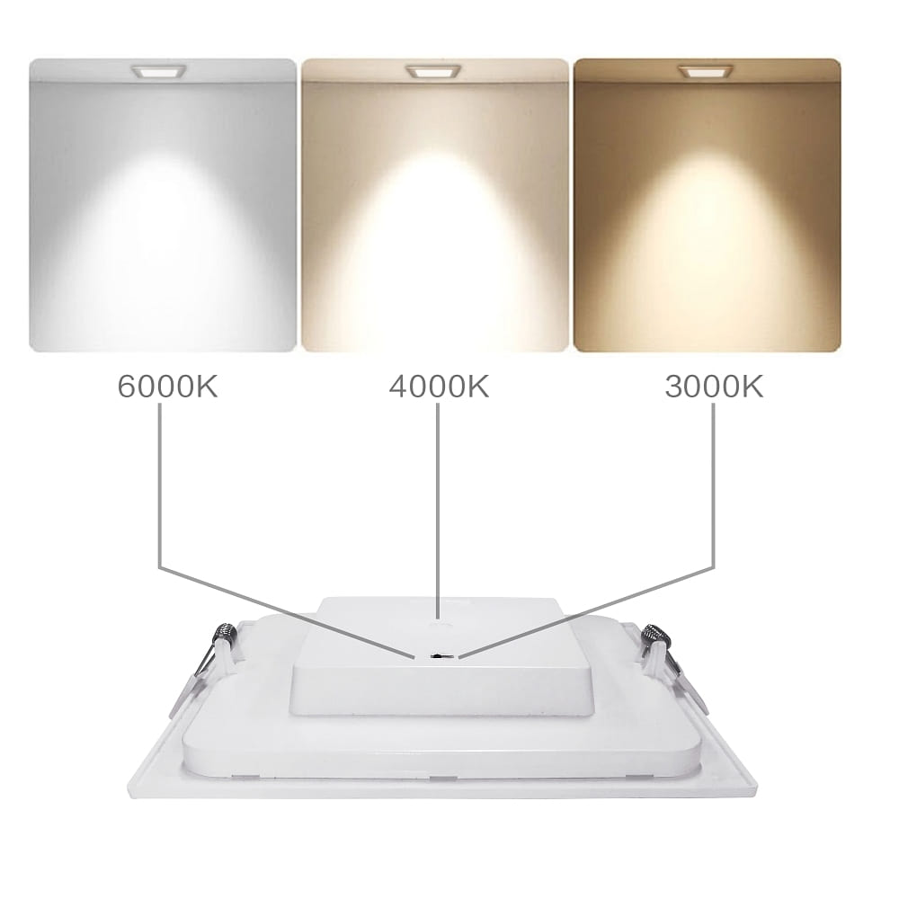 Les dimensions du projecteur encastré LED sont Ø 8cm / L 22cm / l 22cm / É 3,2cm, avec une profondeur d'encastrement de seulement 2,7cm. La température de couleur peut être réglée avant l'installation à l'aide d'un commutateur coulissant (3000/4000/6500 K) et l'indice de rendu des couleurs est de 80Ra.